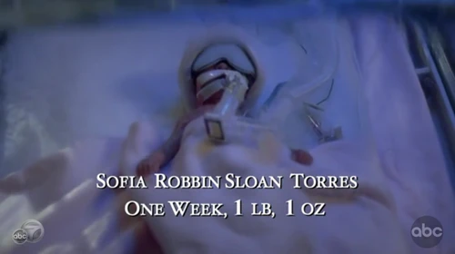 Sofia naît seize semaines avant le terme sans battement de cœur, pesant moins de 500g. Arizona parvient à la réanimer et elle est placée dans une couveuse, ses poumons et autres organes internes n'étant pas complètement maturés. Elle est ensuite amenée aux Soins Intensifs Néonataux et mise sous respirateur étant donné qu'elle est incapable de respirer seule. ("Aimer, prier, chanter")