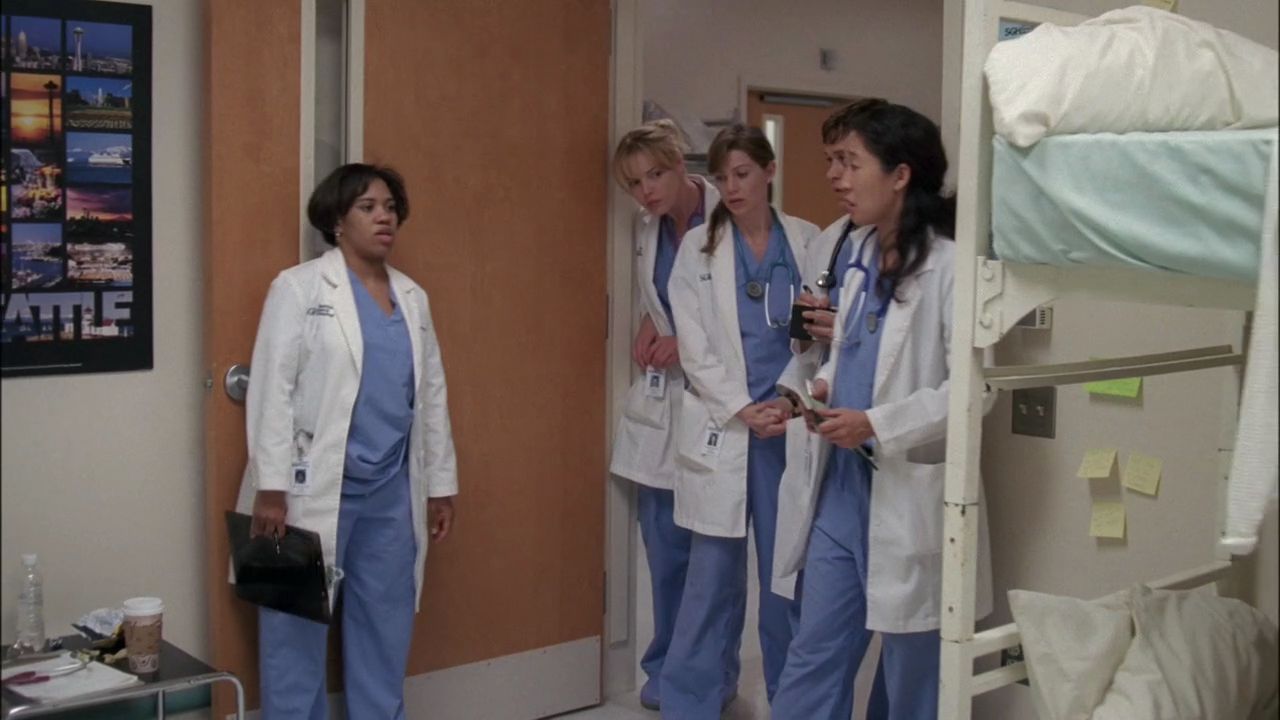 In the locker room, Meredith bonds with another intern, Cristina Yang. They discover that they have the same resident, Bailey or "The Nazi". Overhearing the conversation, another introduces himself as George O'Malley. He talks nervously and tells Meredith that they met last night. He describes what she was wearing but quickly stops when he realizes they think he is gay. The three interns (along with another intern, an ex-model, Isobel Stevens) are called out to go to Bailey. Walking up to Bailey, they are shocked to see she is a woman (and not a nazi either). Isobel suggests that the nickname may be professional jealousy. Cristina scoffs but nevertheless, Isobel introduces herself to Bailey, telling her that she is Isobel Stevens but that everyone calls her Izzie. Bailey ignores the introduction, shows them their equipment, gives them a short tour and tells them her rules. She then receives a page and she and the interns run onto the roof. On the roof, a chopper lands and gives details on the patient (Katie Bryce) who is having seizures. In the hospital, the interns and nurses inject Katie who finally stops moving. Another doctor, Preston Burke, walks in and describes her as a wet fish on dry land. He then orders them to do all the basic tests. George is work ups, Cristina is to do labs, Meredith is assigned to Katie Bryce and to get her a CT. Izzie is ordered to perform rectal exams by a smiling Bailey.