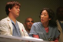 While waiting impatiently for Dr. Shepherd, Cristina sutures a banana. She then calls George 007 when he laughs, but she quickly apologizes saying she gets mean when she's tired. Shepherd then walks in and explains that Katie is having seizures with no visible cause; she is a ticking clock. The intern who finds out the cause will get to scrub in on the advanced surgery. All the interns take copies of the chart.