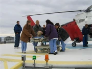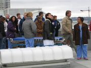 In the locker room, Meredith bonds with another intern, Cristina Yang. They discover that they have the same resident, Bailey or "The Nazi". Overhearing the conversation, another introduces himself as George O'Malley. He talks nervously and tells Meredith that they met last night. He describes what she was wearing but quickly stops when he realizes they think he is gay. The three interns (along with another intern, an ex-model, Isobel Stevens) are called out to go to Bailey. Walking up to Bailey, they are shocked to see she is a woman (and not a nazi either). Isobel suggests that the nickname may be professional jealousy. Cristina scoffs but nevertheless, Isobel introduces herself to Bailey, telling her that she is Isobel Stevens but that everyone calls her Izzie. Bailey ignores the introduction, shows them their equipment, gives them a short tour and tells them her rules. She then receives a page and she and the interns run onto the roof. On the roof, a chopper lands and gives details on the patient (Katie Bryce) who is having seizures. In the hospital, the interns and nurses inject Katie who finally stops moving. Another doctor, Preston Burke, walks in and describes her as a wet fish on dry land. He then orders them to do all the basic tests. George is work ups, Cristina is to do labs, Meredith is assigned to Katie Bryce and to get her a CT. Izzie is ordered to perform rectal exams by a smiling Bailey.