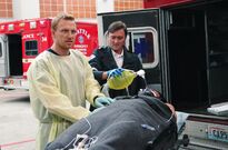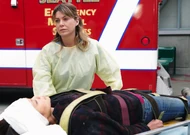 Owen joins Meredith out in the ambulance bay. Meredith is still pissed at him for sending Cristina out while she should be here, at the hospital. The ambulance arrives with Trina Paiz who's got a lacerated ear. She fell 100 feet into a ravine, but her husband broke her fall. Jason Paiz is in the second ambulance. As Meredith takes Trina inside, she hopes her husband's okay.