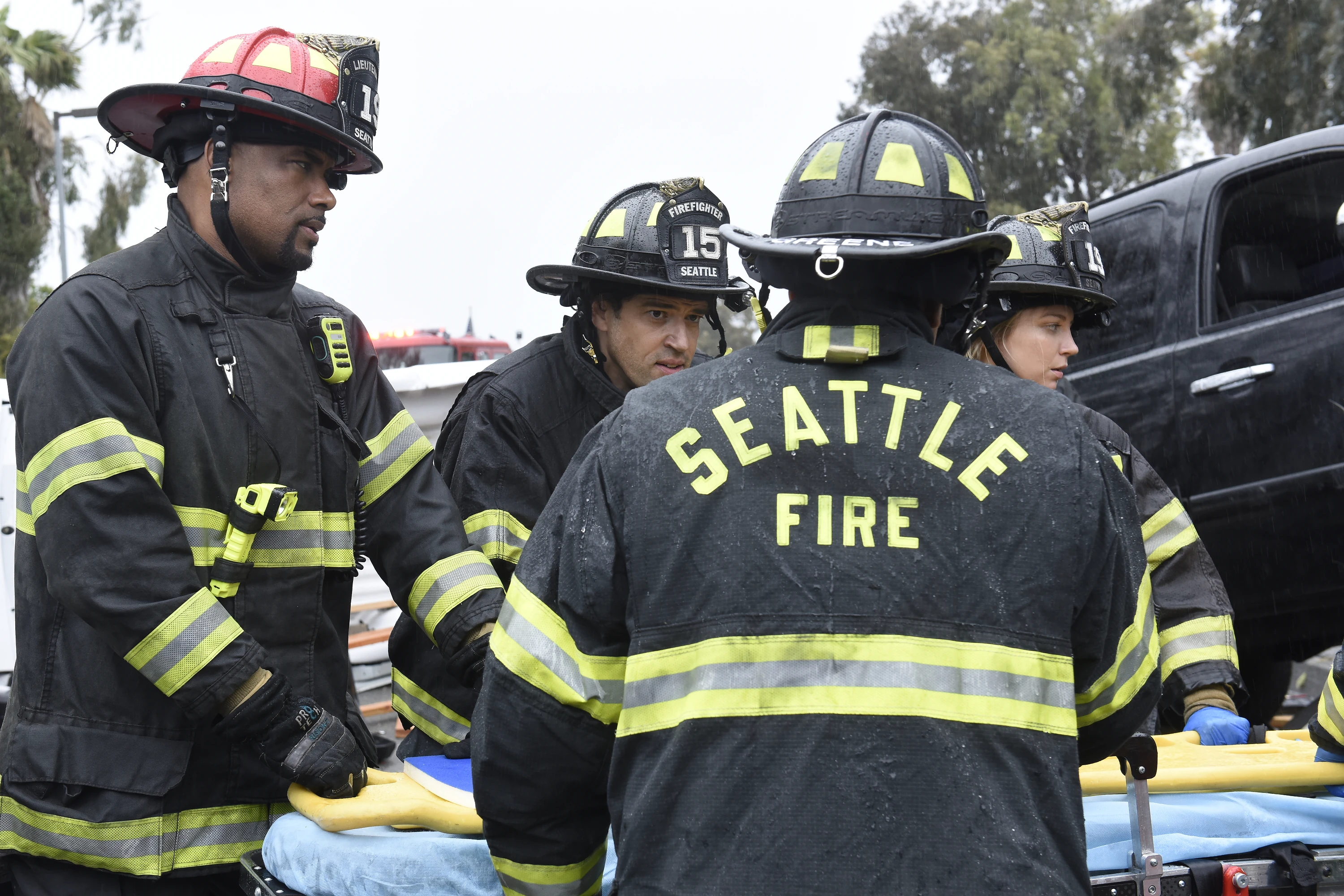 Station 19 was called out to Interstate 5 Seneca Street. They arrived to find a multi-car accident. In one car, which had been crushed from behind by an SUB, Paige Donahue was driving with her friend, Margot Ford, in the front passenger seat and Fynn in the back seat. Margot's feet had been on the dashboard, so her legs were seriously injured on impact. Paige was conscious, but in shock and unable to respond to questions. In the backseat, Beckett determined that Fynn had died. In another car, Jonathan Tucker and Edna Gherkes were trapped. Edna was unconscious. She woke up as they worked on the car. She said her neck was tight, so they put a collar on her. The steering wheel was crushing John's chest, so they called for tools to get him out. Back at the other car, Vic stabilized Margot's leg in preparation for getting her out of the car. They then got the door open. When they got back to John, he was coughing up blood and struggling to breathe. They got Edna out of the car. Margot was removed from Paige's car, then they got ready to get Paige out. John was freed from his car, but arrested and had to be resuscitated. He was then loaded into an aid car. Paige was also extracted and moved to an aid car.