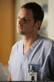 Izzie walks out of the hospital and sees Scott in a wheelchair and Alex pushing him. Scott and Alex talk about Scott's decision. Scott is afraid his father is going to hurt his mother again. Alex says not to make his decision out of anger. Scott starts to ask Alex what he did with his father but Izzie catches up to them. Alex tells her to give them some space. Izzie stands several feet away. Alex crouches and says that he bulked up and became a wrestler. The next time his father laid a hand on his mother, he beat the crap out of him. His father was in such bad shape he needed to be sent to the hospital. When he got out he left and never came back. Izzie hears all of this. Alex says, "He was a cold, mean tempered bastard but he was still my old man, you know? And now, now I can't stop wishing I never laid a hand on him. That we somehow could've worked it through." Alex and Scott go to where Izzie is waiting. She apologizes for interrupting. She tells Scott that Burke needs a decision now.