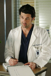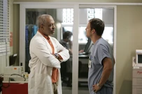 Derek is examining Richard. Richard looks very awkward being touched. Derek says he has to examine him in order to discharge him. Richard's wife, Adele, comes into the room. and says, "What makes you think he wants to be discharged?" that the hospital would crumble if Richard wasn't there. Chief is surprised she is there, she is supposed to vacationing in the Virgin Islands. She is upset that he had brain surgery without even telling her. Richard offers a couple excuses why he didn't tell her. Richard wonders how she even found out about it. He realizes it was Derek. Richard asks, "You called my wife?" To which Derek replies, "You called mine. Look, having someone home with you is the only way I'm letting you out of here today." Richard agrees. Addison comes to the doorway and greets Adele. They look like old friends. Adele says, "I told Richard you and Derek would be getting back together." Derek says, "Addison and I are over... practically divorced" that adultery is enough to end it. Addison leaves and Adele tells Derek to give her a chance. As Derek leaves he tells Adele to "keep him in line". Richard doesn't look happy about this.