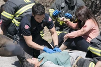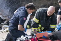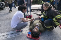 As they're heading back to the station, Maya reminds Ben that Andy helped him train when he first joined the team. Andy asks her to stop campaigning. Maya says she's just shining a light on Andy's Captain-material truth. Andy says the peer reviews are out of their control. The engine comes across an MVC. Ben calls dispatch while Andy informs the other vehicles. Ben wonders if the aid car will have to stop with Peter in it. Andy seems to think so since the most dangerous thing with an MVC is people bleeding out in minutes. Ben is informed that Station 23 is 8 minutes out. That's too long, so they decide they are pulling over to help.