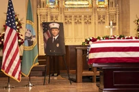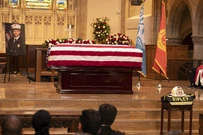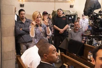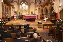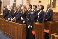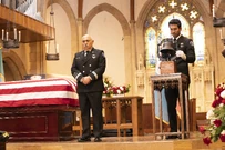 Vic, Jennifer, and Robert walk behind the coffin as it is carried into the church. Vic wants to go sit with her crew, but Jennifer asks her to sit with her.