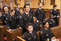 Andy complains to Ben about Ryan taking up a job without telling her. Ben did a similar thing. He asks Andy what a firefighter funeral is like. Andy says it's beautiful, sad, and hard. The honor guard will be there. Near the end of the funeral, someone will ring 20 bells to signify a firefighter's end of watch. It's to announce that one of them has come home for the last time. Andy says her dad rang bells on the night of his mother's funeral in their bedroom. She sat out in the hall and listened to his ringing it over and over. They arrive at the scene. The caller doesn't answer the door. He called it in himself, but maybe he lost consciousness. Andy then kicks in the door. They look around the house and hear a man calling for help. They find Nate on the floor in the living room impaled by a chandelier.