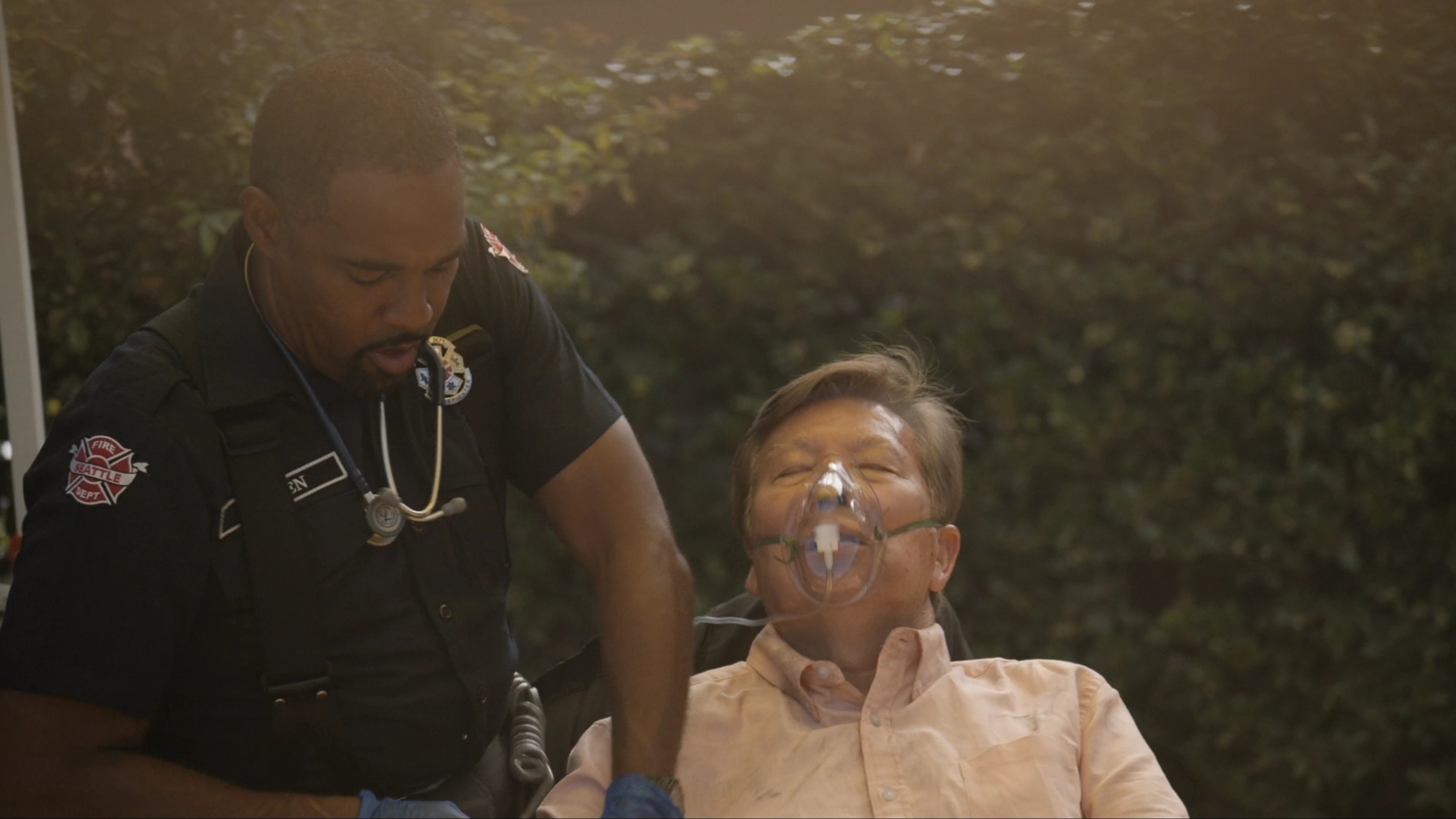 Gerald and his wife, Ivy, were at home when their apartment complex caught on fire. Because Gerald uses a walker, they were unable to evacuate themselves. When firefighters arrived, they assisted Gerald out of the building and pushed Ivy to walk herself out, stopping her from continuing to grab things, though she did bring out their wedding album. Once they were outside at triage, Ben and Travis gave them both oxygen masks and called for an aid car to take Gerald to the hospital. While they waited, Gerald went into cardiac arrest. They were able to restore sinus rhythm with CPR and then defibrillation. Ivy and Gerald were then put into an aid car so Gerald could be treated at the hospital. On the way, Ivy asked the firefighters about their lives and learned that Travis was running for mayor and that he was also single and gay. Ivy wrote down his name and then also wrote down her grandson's number for him.