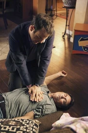 Sam tries to shock Pete's heart with the paddles, but it's not working. Cooper has to squeeze the heart manually. As Sam urges Cooper to squeeze harder, Sam notices Violet is standing outside, watching them.