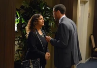 Richard and Catherine walk out of the hotel. She better go in order not to miss her flight. She kisses him goodbye and says she doesn't regret last night even a bit. Neither does he, but it's just bad timing since they live in different cities. She agrees. He asks her to call him if she knows more about the boards, and she asks him to call her to let her know he got home safe. Before getting in a cab, she asks if he's going to a certain conference in May. He's speaking there. They start comparing agendas.