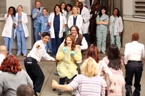 In the ambulance bay, April asks the paramedic about their patient. While April is asking some more questions, there begins playing music. The paramedics and the patient, who jumped off the gurney, start dancing. April is clueless. Suddenly, there appear more people from behind and out of the ambulances, and there come some running down the stairs. They all start dancing while other doctors and nurses come outside to watch. April recognizes some faces and doesn't get what's going on. Then there's Matthew running down the stairs, and dancing his way towards April. "They're everywhere," Meredith says. "Who would've thought Kepner would've found someone as dorky as she is?" Alex asks. "He is like the male Kepner, what are the odds?" Meredith agrees while Matthew gives April a rose. The music stops, and everybody applauses, except Cristina, whose face says it all. Matthew begins his charming speech. "When I first saw you in this doorway, I felt a shock," Matthew says. Arizona and Lauren give each other a look. While Matthew goes on with his love speech, April starts crying. Paramedic Nicole then gives Matthew a little box. "Oh my God!" April says. Matthew then kneels down. "April Kepner, I love you and I wanna spend the rest of my life trying to make you as happy as you make me, if you let me. Will you marry me?" he asks, while opening the box, which contains a ring. While she says yes, the group of dancers throw rose petals. Every spectator, including Jackson, applauses while the engaged couple kisses.