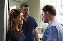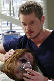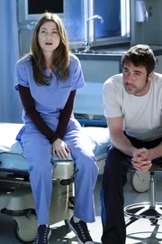 Derek sits down in the waiting room. A man asks him whom he's here for. His wife was run over on the ferry. He's having trouble to get people to talk to him. Derek understands. It's out of their hands. It's up to the doctors. The man asks his girlfriend's name. He says Meredith. The man will put her in his prayers.