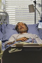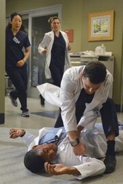 Alex comes into the OR where Cristina and Meredith are operating. He says Jimmy's BP has tanked. Cristina asks if he's in and out of consciousness and Alex confirms that he is. He asks if this is it, the end. Meredith asks if he's okay. He says for her to give him a break, that she of all people should understand. He leaves. Meredith asks if there's anything they can do. She says that Jimmy has a DNR, so she doesn't think so. She'll take a look once they're done operating.