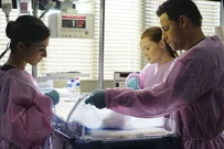 Penny, Nathan, Amelia, and Alex are working on the baby. Nathan says he needs to go on ECMO as it's the baby's only chance. Since the parents are both in the OR, they don't need parental consent. Nathan makes a cut in the baby's neck.