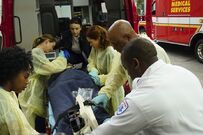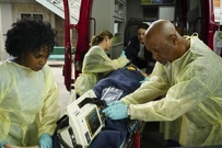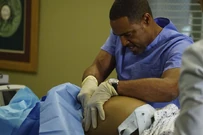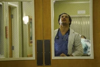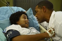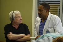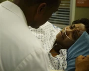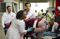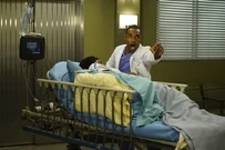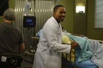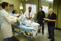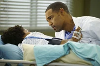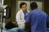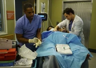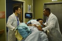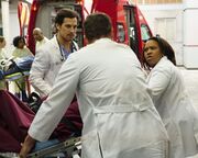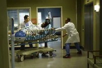 Richard, April, Stephanie, and Meredith check on Omar, who was brought in by another ambulance. Stephanie barely feels a pulse. Omar was unrestrained and got T-boned from the side.