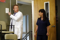 Arizona asks Alex to switch, but Cristina can't allow it as Arizona is holding the mitral valve. Arizona then asks Alex to take a scalpel and stab her in her prosthetic foot. Alex doesn't listen, thinking she's gone crazy. "Dr. Karev, I'm the Chief of Surgery, this is an order: stab Dr. Robbins in the foot right now!" Owen tells him as Alana walks back into the gallery. "Of course," Owen says, when Cahill gives him a strange look. Meanwhile, Alex takes a scalpel and stabs Arizona in the foot. This really helps Arizona.