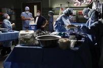 Owen is trying something new with Arizona. She has to teach her mind to calm the waves of the sea she sees on a screen. This will help her teach her mind to calm the pain. It's not working, but as it's the only option left (besides stabbing her prosthetic), she decides to try again.