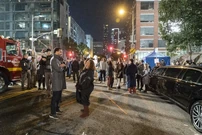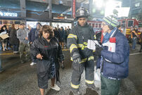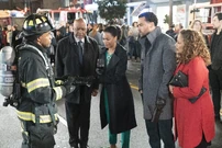 A group of people are standing on the street outside Jackson's building with firefighters buzzing around them. Catherine reminds Richard she told him she didn't want to have a party.