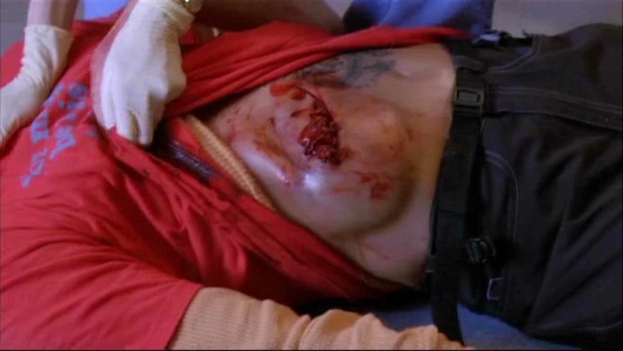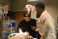 Meredith and Alex work in Trauma and Meredith sees Viper waiting in a chair. She asks Alex why he is there and how long he's been waiting, but Alex says he doesn't know, he was busy on real cases. Viper starts to cough and Meredith walks worriedly towards him. He tries to get up and she runs to him, but he falls unconscious and blood is starts to come out of his mouth. She lifts up his shirt and sees that his stitches have ripped open and the area around them has swelled up to the size of a small melon. Meredith gets Viper on a gurney, she gets on top of him and tries to hold his wound closed, she asks a nurse to tell the OR she is on her way and to page Bailey. They arrive and go into the OR. Bailey tells Meredith to scrub in and for Alex to get back down stairs as punishment for only having time for the hot cases.