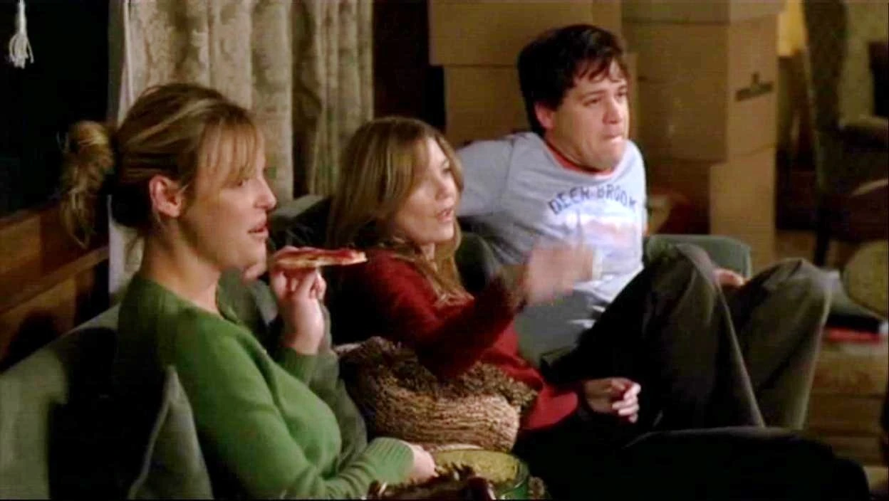 Meredith opens her front door. Izzie, Cristina, and George are eating pizza, drinking beer, and watching a surgical tape. Everyone stops to look at Meredith and George quickly blurts out that Cristina made them watch the tapes. Cristina glares at him. Meredith asks what they are watching, sits down and grabs some popcorn. They watch for a few seconds and then suddenly, they all recoil screaming and laughing with shock at the tape.