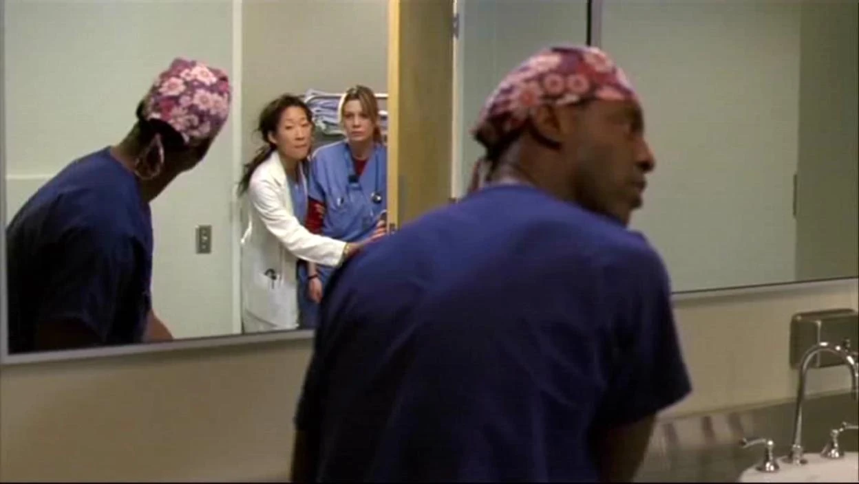 In the men's bathroom, Meredith and Cristina look in to see Burke. They ask him to repair John Doe's heart and he notes they like to cross the line, he then tells them to either whip out a penis or get out.